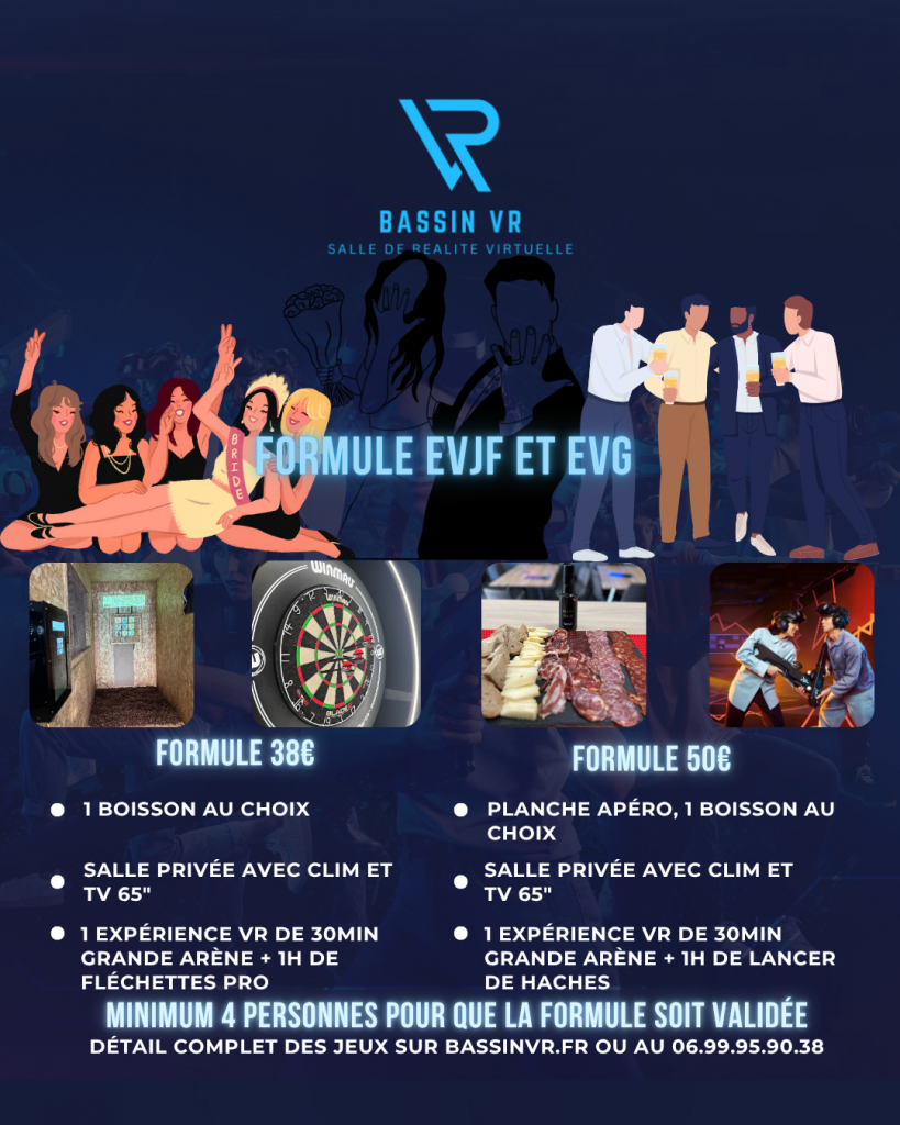 Vous cherchez une idée originale pour l’organisation EVG EVJF Bassin d’Arcachon ? Avec Bassin VR, transformez votre sortie entre amis ou amies en aventure inoubliable. Nos activités immersives et ludiques garantissent des fous rires, des défis collectifs et des souvenirs mémorables.